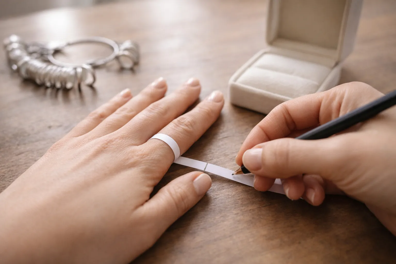 Repérez une bague portée sur l’annulaire (si c’est pour une bague de fiançailles, c’est souvent l’annulaire gauche). Mesurez son diamètre intérieur rapidement, ou tracez l’intérieur de l’anneau sur une feuille pour garder un gabarit.